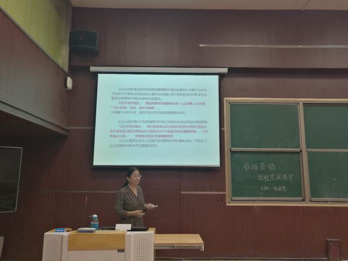 祖利然副教授结合专业,介绍了市场营销“课程思政”的目标、内容、原则和方法,认为首先在思想观念上要确立 “育人”目的,深入学习党的十九大精神,学习党和国家以及业务主管部门对应的经济、政治、文化、社会、生态或党建的相关理论,从中挖掘思政元素,进而结合专业课程谈思想、说素养、讲故事,把思政教育渗透进学习过程的每一环节,包括培养方案、教材选用、课前预习、课堂教学、课后作业、案例讨论、社会实践等方面。在将思政元素融入专业教学,运用马克思主义立场、观点和方法解释相关内容的同时,教师还要注重以德立身、以德立学、以德施教,为员工点亮理想的灯、照亮前行的路。最后,她以“宏观环境分析”一节为例,直观地展示了专业课程思政教学设计方案,并与参会的老师进行了深入讨论和交流。