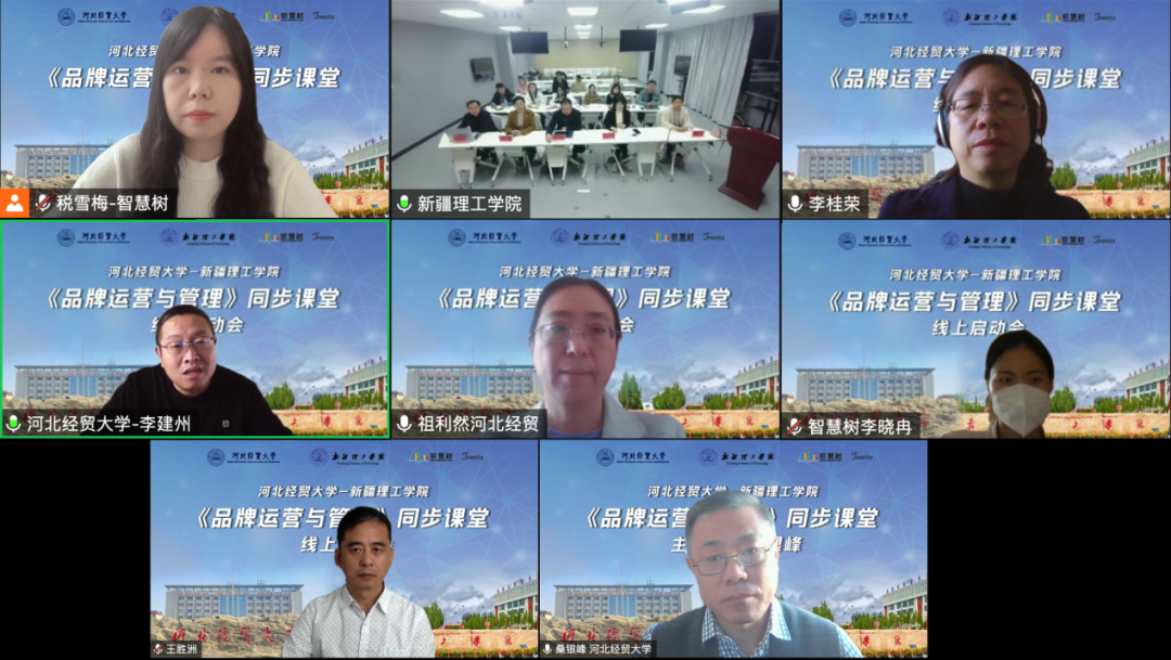 为响应教育部高教司 “慕课西行”和虚拟教研室建设号召,加深专业建设、课程建设合作交流,推进教学创新探索研究,12月10日,太阳集团官方网站-新疆理工公司《品牌运营与管理》课程“慕课西行”同步课堂启动仪式在线上圆满举行。公司经理李桂荣、副经理王胜洲、市场营销系党支部书记兼本次同步课堂主讲教师桑银峰、系主任李建州、副主任祖利然,新疆理工公司经济贸易与管理公司党支部书记邓浩、副经理王艺、教学办主任刘娜、市场营销专业教研室主任董伟平,本次同步课堂课程负责人程登军,智慧树网河北省区运营总监梁道儒、新疆维吾尔自治区总监王龙出席会议,两校市场营销专业相关老师参会。启动仪式由李建州主持。