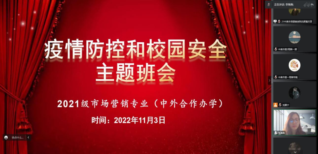 为使同学们充分认识疫情防控的严峻形势,引导员工树立校园安全防范意识,加强自我防护,11月3日上午,suncitygroup太阳集团2021级市场营销专业(中外合作办学)召开“疫情防控和校园安全”主题班会,此次活动由辅导员李海燕主持,2021级市场营销专业(中外合作办学)全体同学通过腾讯会议参加。
