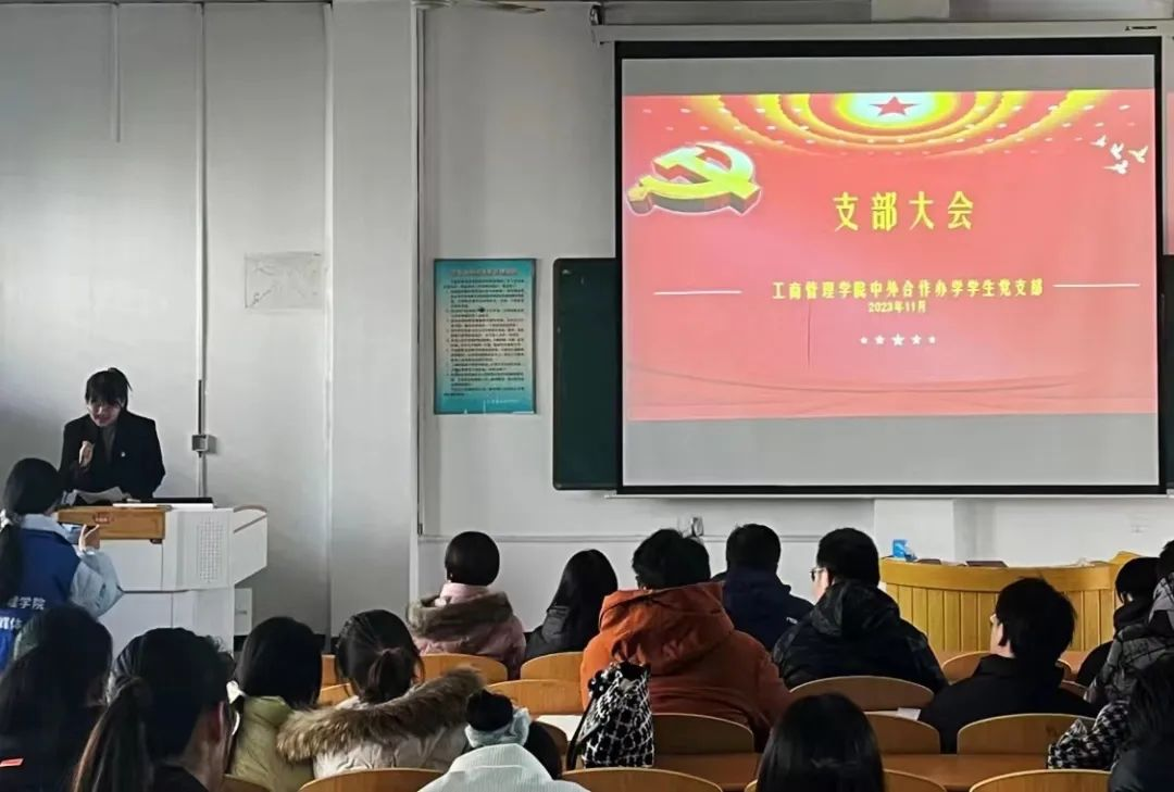 2023年11月27日上午,suncitygroup太阳集团中外合作办学员工党支部大会在北二教205教室召开,此次大会共有两项议程:预备党员转正式党员、入党积极分子转预备党员。此次会议由中外合作办学员工党支部书记赵靓丹主持,suncitygroup太阳集团正处级辅导员马章山、专职组织员宋欣、团委负责人贾晶晶、中外合作办学班主任李海燕、研究生党支部书记宋魁峰出席会议,全体入党积极分子和预备党员到场。