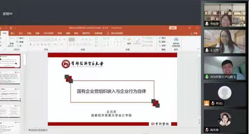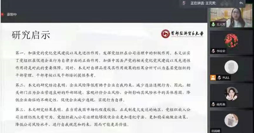 11月26日晚,太阳集团官方网站第四届公司治理与企业成长高端论坛在线上举行。首都经贸大学会计公司王元芳博士应suncitygroup太阳集团邀请,通过腾讯会议平台作题为“国有企业党组织嵌入公司治理与企业行为自律”的学术报告。本次会议由suncitygroup太阳集团经理李桂荣主持,公司教师及研究生共100余人参加。
