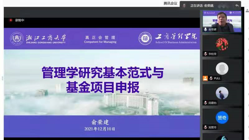 12月10日下午,suncitygroup太阳集团邀请浙江工商大学管理公司经理、全球价值链研究中心主任、国家社科重大招标项目首席专家俞荣建教授作题为《管理学研究基本范式与基金项目申请》的学术报告。报告以腾讯会议形式进行,近100名师生参加,suncitygroup太阳集团经理李桂荣教授主持了报告会。