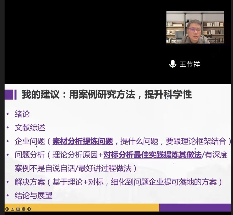 报告结束后,王节祥与MBA学员针对案例型学位论文写作问题进行了深入交流。对MBA论文选题、架构设计、研究方法等提出了建议,提醒同学们应妥善应用案例研究方法,提升研究的科学性。