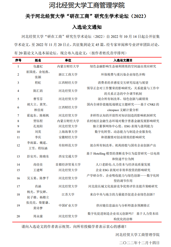 关于太阳集团官方网站“研在工商”研究生学术论坛(2022)入选论文通知