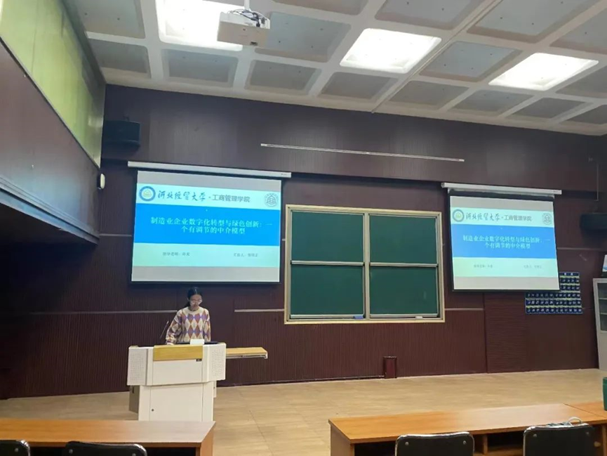 汇报人窦博文以“制造业企业数字化转型与绿色创新:一个有调节的中介模型”为题,从研究背景、研究意义、理论基础与研究假设、研究设计、实证分析、研究结论与展望六个部分展开汇报,主要讨论了制造业企业数字化转型影响绿色创新的作用效果、内在机制与边界条件。