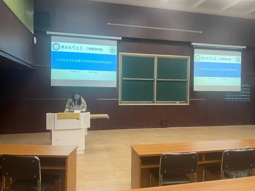 汇报人周嘉怡以“CEO自恋对企业数字化转型的影响机制研究”为题,基于企业数字化转型的现实困境及CEO人格特质对企业战略的重要性阐述论文的研究背景。对企业数字化转型的影响因素和CEO自恋的后效研究分别进行文献综述,并在此基础上基于高阶梯队理论,从CEO的人格特质入手,剖析自恋特质对企业数字化转型的影响,深入探究具体的影响机制及边界条件。运用固定效应模型对假设进行了实证分析与验证。研究结果对数字经济时代企业如何开展数字化转型具有理论意义和实践意义。