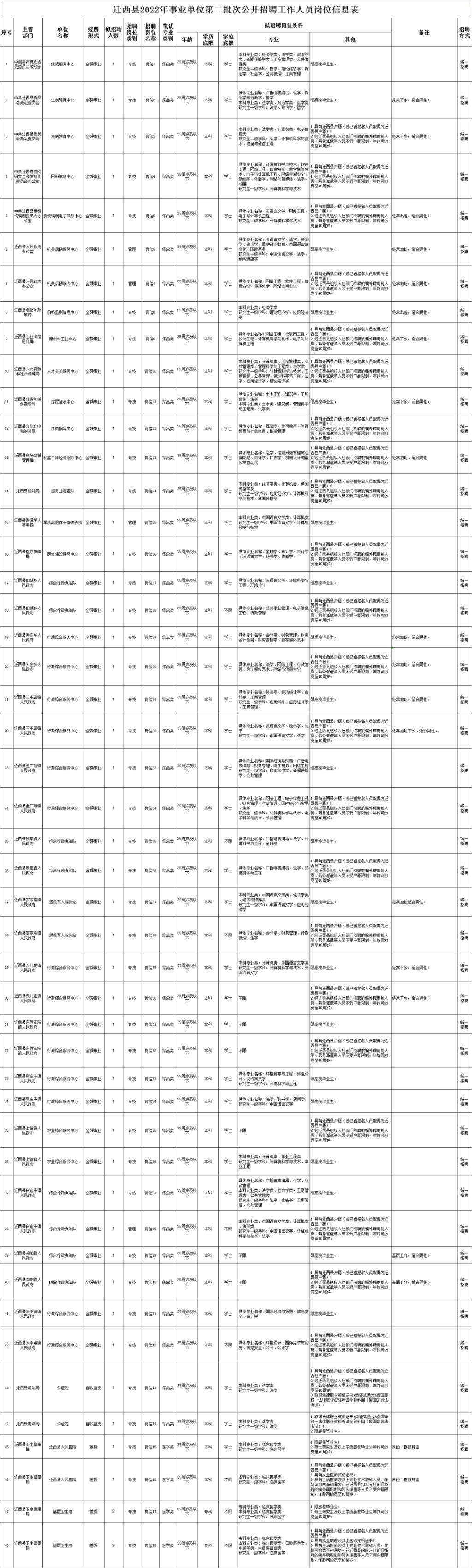迁西县事业单位招聘工作人员57名。具体招聘人数和岗位条件详见↓↓↓