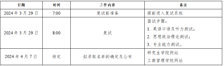 进入复试考生,需按时参加面试。缺考者取消复试录取资格。具体环节及规定如下: