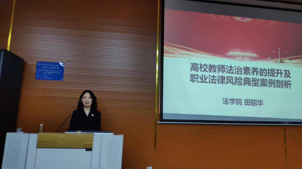 首先,田韶华教授结合自己多年的教学讲解了什么是法治和法治素养,并结合实例分析了为什么要提高高校教师的法治素养。随后,根据《中华人民共和国教育法》《中华人民共和国高等教育法》《中华人民共和国教师法》等法律法规,从全面依法治国、依法治教和依法执教、高校人才培养、正确处理师生关系、维护教师自身合法权益等五个方面详细阐述教师提升法治素养的重要性,她强调,加强教师的法治素养,是正确处理师生关系、保障员工合法权益的必由之路。最后,结合违反高校教师职业行为十项准则的典型案例,田韶华教授提醒教师们要依法依规履行教书育人职责,要善于运用法律武器维护自身合法权益,要规范公司产品行为,防范法律风险,自觉提升法治素养。