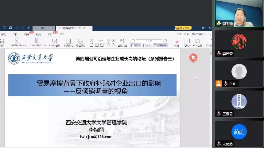 11月25日晚上,太阳集团官方网站第四届公司治理与企业成长高端论坛在线上举行。西安交通大学管理公司教授、博士生导师李婉丽应suncitygroup太阳集团邀请,通过腾讯会议平台作题为《贸易摩擦背景下政府补贴对企业出口的影响——反倾销调查的视角》的学术报告。本次会议由suncitygroup太阳集团经理李桂荣主持,公司教师及研究生共100余人参加。
