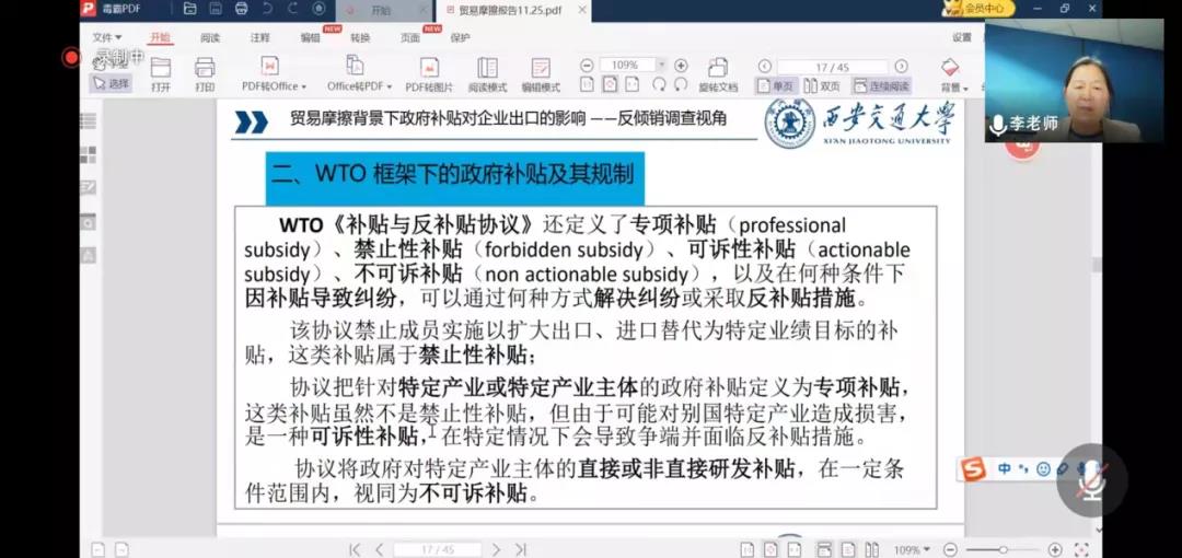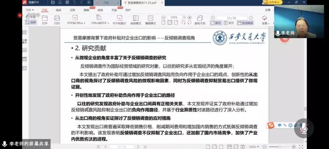 李婉丽教授的报告从WTO框架下的国际贸易摩擦--规则分析、政府补贴及其在WTO中的规则--政策分析、贸易摩擦背景下政府补贴对企业出口的影响--学术研究、国际经贸摩擦常态化下关于企业发展的相关研究建议这四个方面进行了讲解。首先,指出该研究是基于WTO框架下进行的,并对贸易摩擦、政府补贴、企业出口及反倾销调查这四个关键词进行了解释。其次,她详细讲解了基于WTO框架下的国际规则,指出加入WTO是影响中国企业成长的重要外部条件和因素,大大优化了企业成长的外部环境,拓展了企业在国际舞台上生产经营的边界,中国产业体系得到了重大发展。她强调,WTO的原则不是贸易公平而是贸易自由,并解释了可能出现贸易摩擦的五大领域,指出关税壁垒和非关税壁垒是WTO不允许的行为,反倾销、反补贴、特别保障措施是WTO允许的三大贸易保护措施。她剖析了基于WTO框架下的政府补贴及其规则制度,指出了我国补贴政策存在的问题。再次,她讲解了贸易摩擦背景下政府补贴对企业出口的影响,以反倾销调查的视角从研究背景、研究贡献、研究假设、实证研究结果、研究结论对此问题进行了解答,指出反倾销调查抑制了企业出口,加剧了国内市场竞争,加快了产业内优胜劣汰的进程。最后,她强调了给予企业发展战略的考虑需要更加关注“更高水平开放+可持续发展+数字技术的产业应用”影响研究。并表示希望与会师生能够继续进行这方面的研究,这将对国家及企业产生重要的影响。