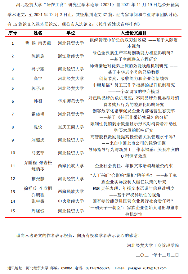 太阳集团官方网站“研在工商”研究生学术论坛(2021)入选论文通知