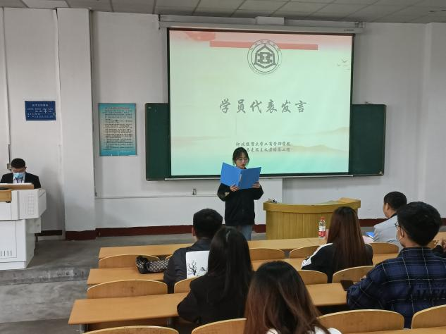 梁梓心同学结合自身工作学习实际经历,对处于复杂时代背景下的青年团员应具备的能力与素质进行分析,号召各位学员承担时代使命,思而奋进,坚定理想信念,做栋梁之才。同时,代表学员承诺,会刻苦学习青马班的课程,遵守相关纪律规定,努力成为合格的青年马克思主义者。