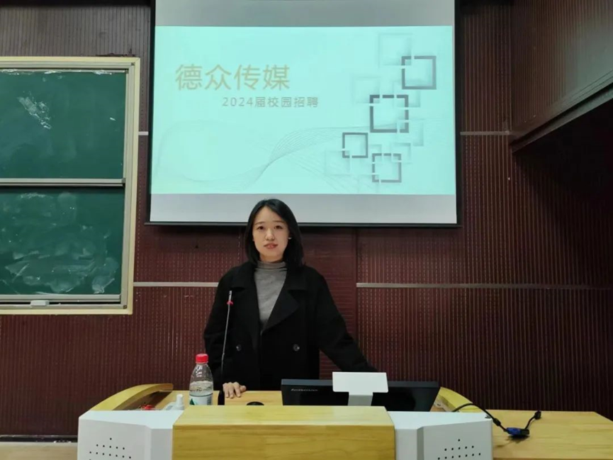 会议伊始,郑芮向同学们介绍了德众传媒的关于我们,其中包括组织架构、合作客户和企业荣誉等,详细讲述了公司的发展历程以及主要工作内容,有助于加强员工对公司的了解,进行针对性的准备,做好长远规划。接下来,她向同学们讲述了德众传媒和谐的企业文化,重点强调了“厚德、坚韧、创新、共赢”的精神风采,使同学们充分了解到公司良好的工作氛围,同时促进他们认清自身的优势与不足,更好地调整自己的求职策略和职业规划。随后她详细讲述了公司优厚的薪酬福利、双晋升机制以及人才需求,表达了企业吸收新鲜活力的期望。最后,是问答环节,同学们针对招聘会的内容进行了相关提问,郑芮对同学们提出的问题做出了详细的回答,让同学们受益匪浅。