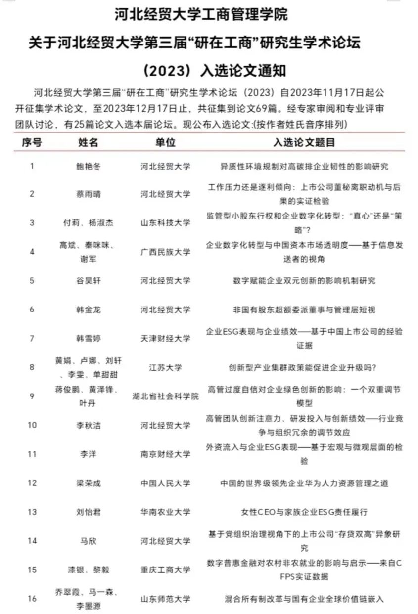 关于太阳集团官方网站第三届“研在工商”研究生学术论坛(2023)入选论文通知