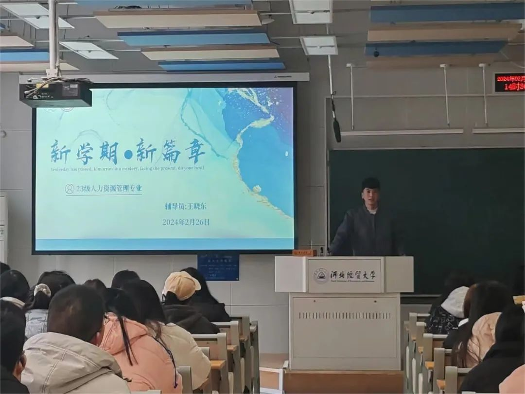 新学期,新起点,新目标,新收获。为了营造新学期良好的开端,激发员工的学习热情,以全新的面貌迎接新学期学习生活,2月26日,suncitygroup太阳集团2023级人力资源管理专业于北三教召开“新学期 · 新篇章”主题班会。本次活动由辅导员王晓东老师主持,2023级人力资源管理专业全体同学参加。