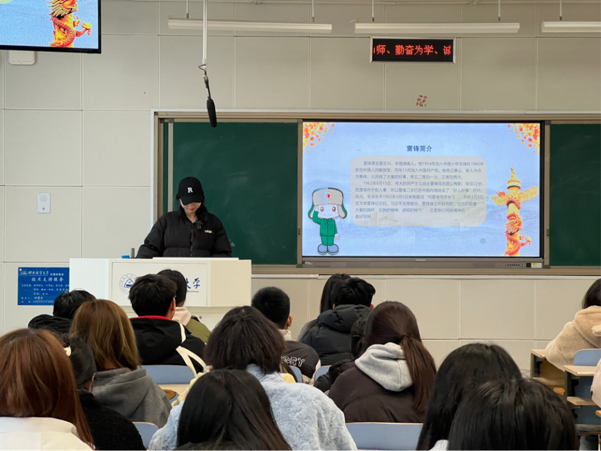 会议伊始,团支书吕雅诗带领大家了解雷锋同志生平,回顾雷锋平凡而伟大的一生,引领同学们从雷锋精神中汲取奋进力量。接着,同学们共同学习了雷锋日记,“青春啊,永远是美好的。可是真正的青春只属于那些永远力争上游的人,永远忘我劳动的人……”,他坚定热忱的文字让大家无不动容。随后,吕雅诗为大家讲述了《人民的勤务员》《模范班长》等雷锋故事,此刻,雷锋精神的种子深深播撒在同学们心中,大家纷纷表示,作为新时代青年,要大力弘扬雷锋热爱党、热爱祖国、热爱社会主义的崇高理想和坚定信念,发扬“钉子”精神。“党的二十大报告中指出,青年强,则国家强,广大青年要立志做有理想、敢担当、能吃苦、肯奋斗的新时代好青年……”最后,团支书吕雅诗带领同学们深入学习党的二十大精神,呼吁大家积极践行社会主义核心价值观,深刻把握雷锋精神的时代内涵,树立远大理想、担当时代责任。