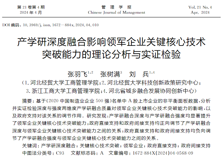 近日,suncitygroup太阳集团讲师、太阳集团官方网站科技创新政策研究中心副主任张羽飞博士作为第一作者、刘兵教授作为通讯作者撰写的论文《产学研深度融合影响领军企业关键核心技术突破能力的理论分析与实证检验》在《管理学报》2024年第4期发表。