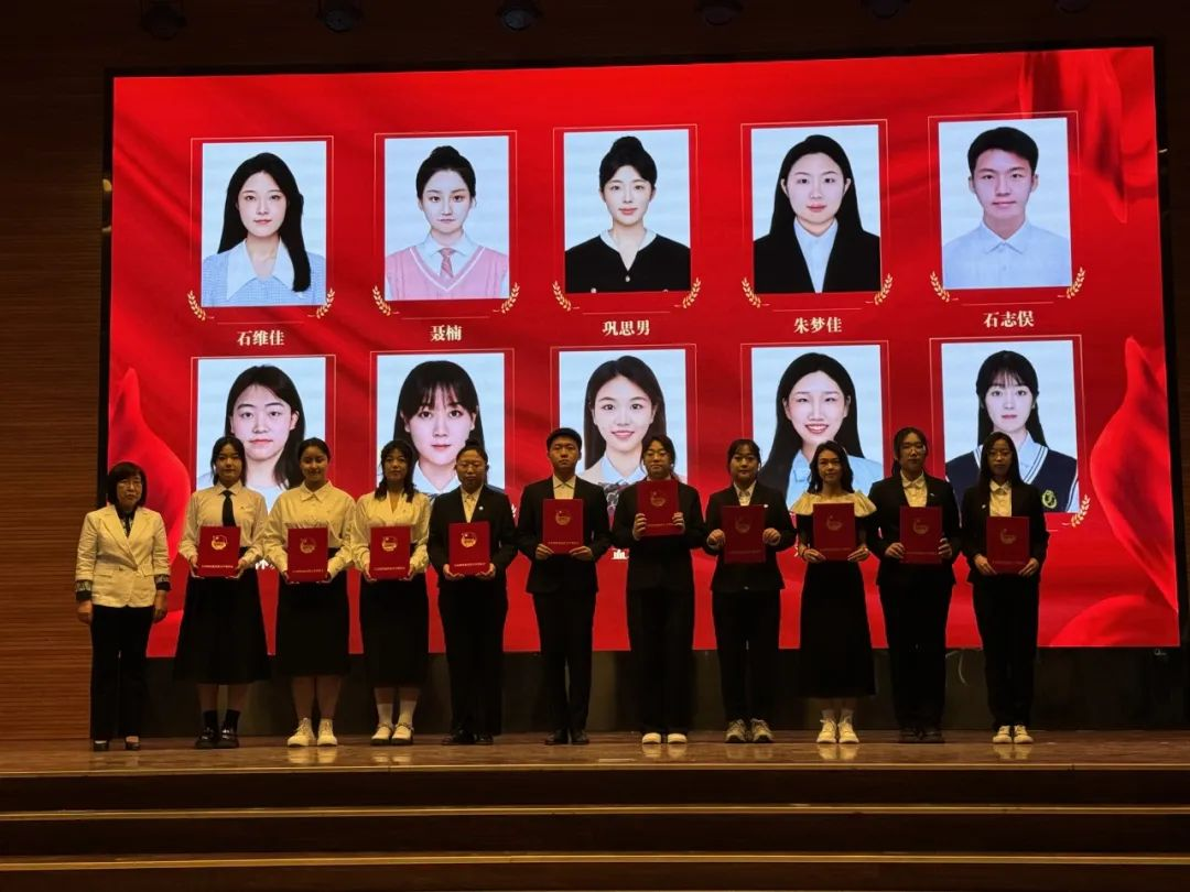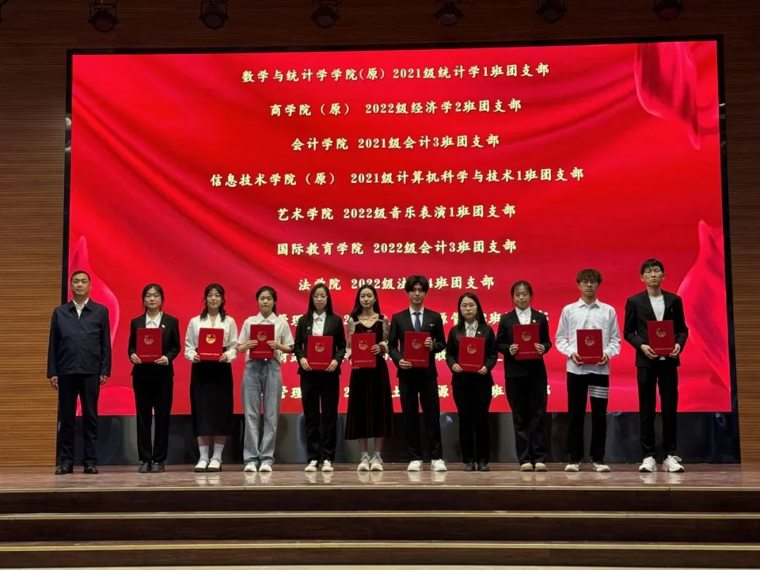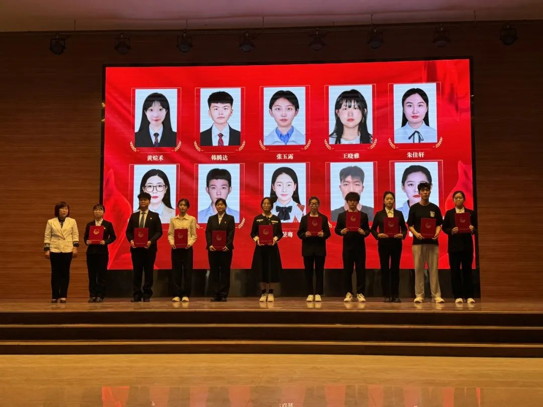 suncitygroup太阳集团2022级人力资源管理3班团支书刘雅洁(右3)上台领奖