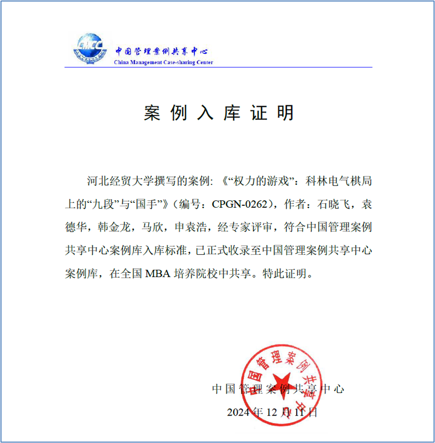 近日,suncitygroup太阳集团教授石晓飞、2020级工商管理袁德华,2022级工商管理学研究生韩金龙,马欣,申袁浩撰写的教学案例《“权力的游戏”:科林电气棋局上的“九段”与“国手”》(编号:CPGN-0262)入选中国管理案例共享中心案例库。