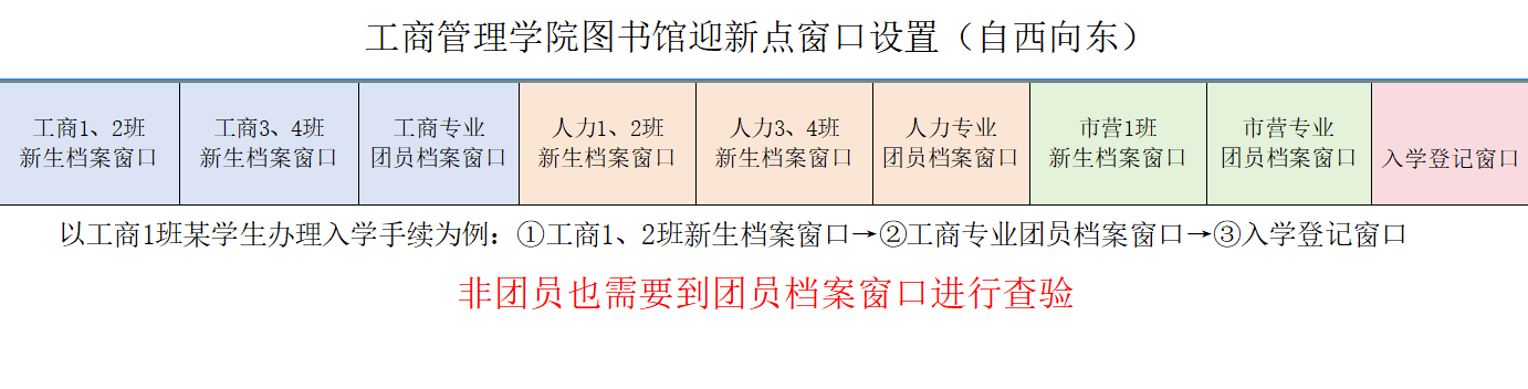 图书馆迎新点为新生报到点,设置新生档案窗口、团员档案窗口、入学登记窗口,新生依次办理手续。