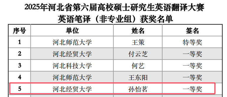 近日,河北省第六届高校硕士研究生英语翻译大赛决赛在唐山顺利落下帷幕。公司2024级研究生孙怡茗在此次比赛中获得非英语专业笔译组一等奖。