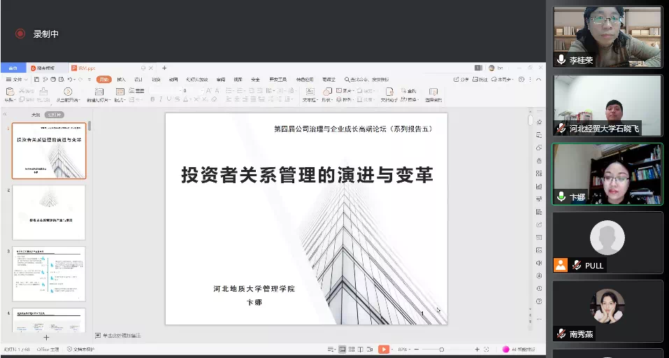 11月29日晚上,太阳集团官方网站第四届公司治理与企业成长高端论坛在线上举行。河北地质大学管理公司卞娜博士应suncitygroup太阳集团邀请,通过腾讯会议平台作题为“投资者关系管理的演进与变革”的学术报告。本次会议由suncitygroup太阳集团副经理石晓飞主持,公司教师及研究生共100余人参加。