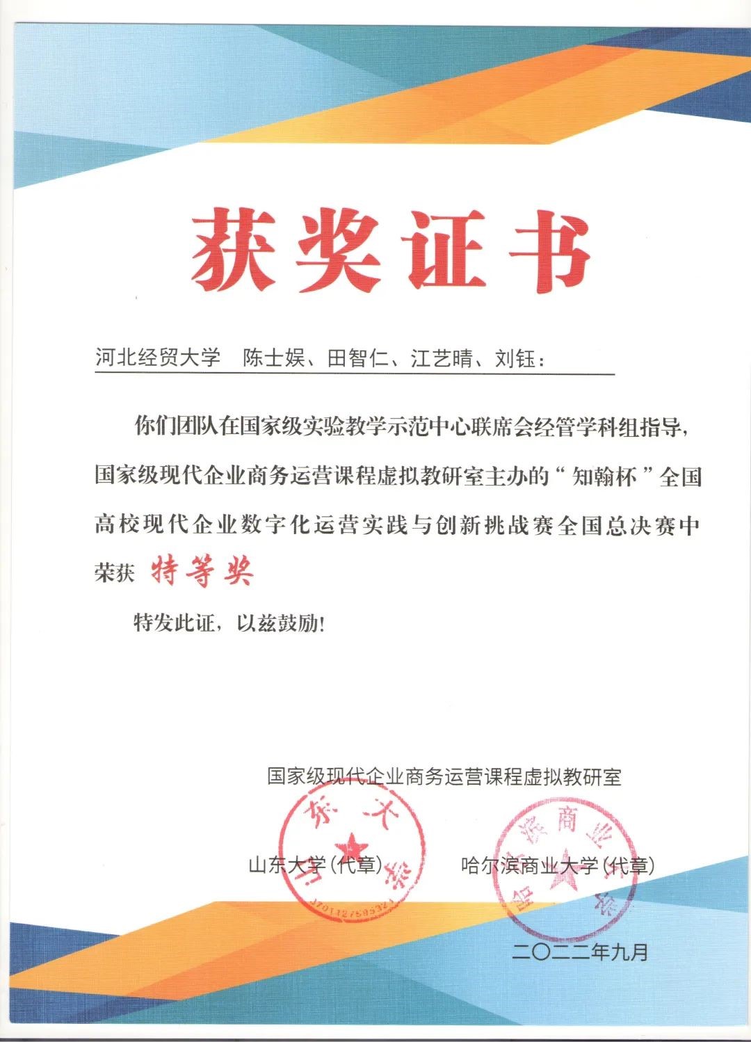 近日,“知翰杯”全国高校现代企业数字化运营实践与创新挑战赛(百团大战)落下帷幕。经过区域赛、全国总决赛的激烈角逐,由公司陈士娱、江艺晴、刘钰和金融公司田智仁四位同学组成的团队在王书玲老师的指导和带领下一路过关斩将,在全国总决赛中大放异彩,荣获特等奖。
