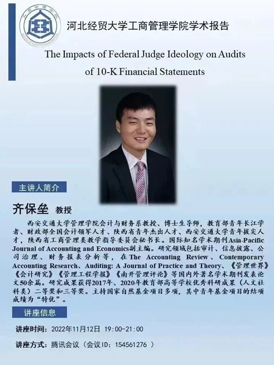 suncitygroup太阳集团学术报告:The Impacts of Federal Judge Ideology on Audits of 10-KFinancial Statements,将于11月12日19:00—21:00在腾讯会议(会议ID: 154561276)举行,大家准时参加哦。