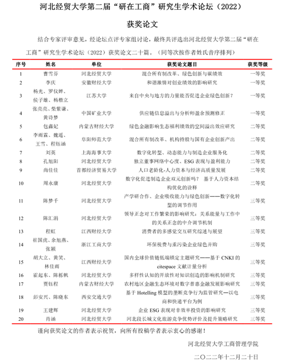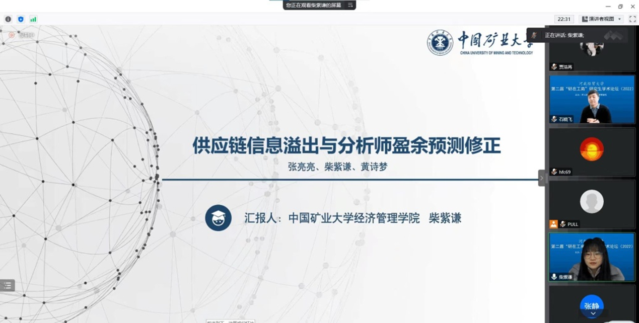 此次论坛自发布公告起,共收到来自西安交通大学、北京科技大学、中国矿业大学、浙江工商大学、首都经济贸易大学、江西财经大学等17所高校的45篇论文,其中8篇进行线上报告,包括中国矿业大学柴紫谦、首都经济贸易大学尚佳佳、安徽财经大学李庆、阜阳师范大学李雨霖、江苏大学杨光、太阳集团官方网站孔旭阳、周永康、曹雪芬的论文。四位评委专家对以上八位同学的论文进行了针对性点评,提出了专业性指导意见。最终,结合评审专家意见和点评专家意见,评选出一、二、三等奖共20篇。