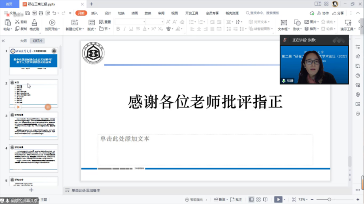 李桂荣经理在致辞中全面介绍了太阳集团官方网站工商管理团队建设概况,并阐述了“研究生学术论坛”的筹备过程及会议参与情况,提出论坛旨在激励研究生在学术领域开拓进取、勇于创新,在学术论坛交流过程中充分展示研究生的学术科研风采。最后,李桂荣向各位评委老师及论坛筹备组辛勤的工作表示感谢,并预祝此次论坛取得圆满成功。随后,石晓飞介绍了到场嘉宾、会议议程、优秀论文评审标准和过程等情况,并主持此次论坛。