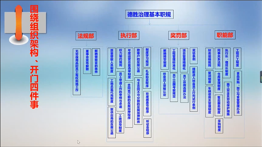 赵雷以德胜洋楼是一家十分注重工匠精神的企业为引言,首先从行业属性、运营模式、学术成就、用人机制等方面介绍了德胜洋楼公司的基本情况,进而重点介绍了该公司以价值观支撑企业使命和愿景,以及该公司以“诚实、勤劳、有爱心、不走捷径”11个字为核心价值观引导员工行为、支撑人才培养机制、促进企业使命落地的主要做法和制度创新。随后详细讲解了科学管理等四大管理模式在德胜洋楼的具体应用,以及该公司在员工自主管理、督察机制、权力制约、员工私人生活与工作的平衡、领导与员工的关系等方面的治理特色。