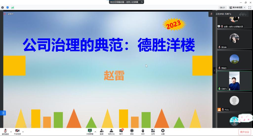 2月17日晚,suncitygroup太阳集团、MBA教育中心邀请德胜(苏州)洋楼有限公司原文化中心总经理赵雷在线作题为“公司治理的典范:德胜洋楼”的报告。报告由副经理石晓飞主持,师生近200人参加。