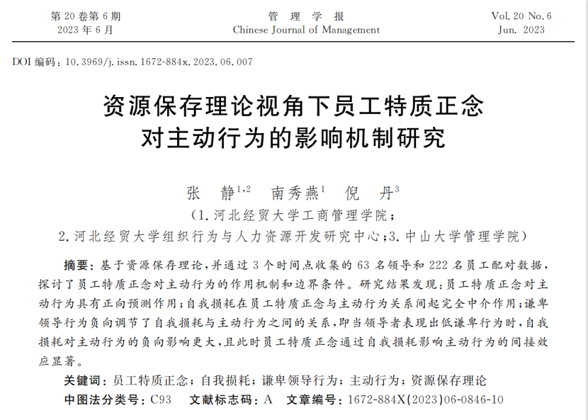近日,suncitygroup太阳集团张静副教授和研究生南秀燕与合作者中山大学管理公司倪丹助理教授的研究成果《资源保存理论视角下员工特质正念对主动行为的影响机制研究》在《管理学报》期刊2023年第6期上发表。