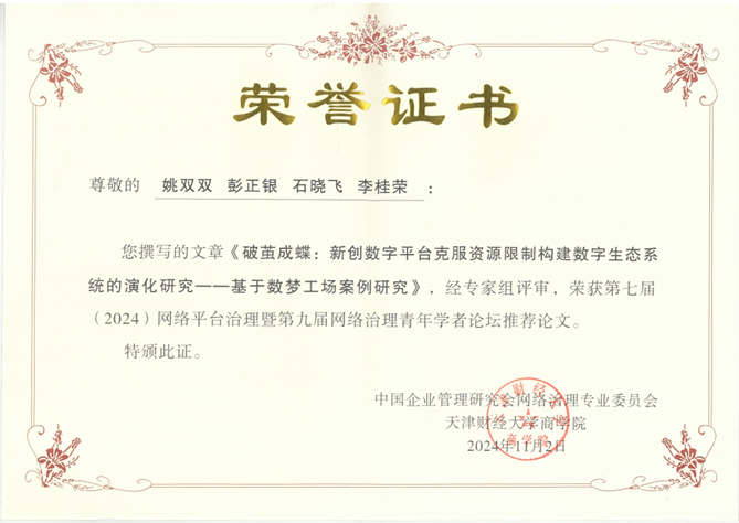 本届会议设置了“数字责任与绿色治理”“数据要素与平台治理”“数字赋能与数字化转型”“组织创新与新质生产力”四个主题分论坛。来自多所高校的学者与参会代表,围绕分论坛主题进行了论文研讨与交流,本届年会共计收到论文投稿200余篇,录用论文40篇,最终8篇获得优秀推荐论文奖。公司教师的合作论文《破茧成蝶:新创数字平台克服资源限制构建数字生态系统的演化研究--基于数梦工场案例研究》入选分论坛“组织创新与新质生产力”分论坛并获优秀推荐论文。
