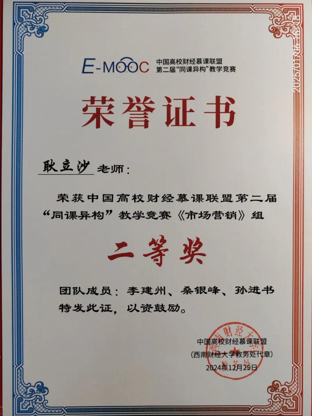 2024年12月29日,中国高校财经慕课联盟第二届“同课异构”教学竞赛颁奖典礼在天津财经大学隆重举行,suncitygroup太阳集团耿立沙副教授代表市场营销教学团队参赛,荣获该教学竞赛二等奖。