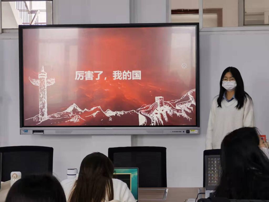主讲人曹雪芬同学以“厉害了,我的国”为主题,从中国电影、中国成就、中国安全及中国体育四个方面展示了中国的强大。首先,简单概括了《长津湖》及《长津湖之水门桥》两部影片的剧情,指出学习和弘扬伟大的抗美援朝精神是我们当代青年的职责和使命。进而提出虽然我们生活在和平年代,但永远不能忘记美好的生活是革命先烈们抛头颅、洒热血而奋斗来的。随后,向大家展示了中国脱贫攻坚及全面建成小康社会的伟大成就。打赢脱贫攻坚战是党取得的重大成就,是政治优势和制度优势的充分彰显。全面小康的圆满收官,突出了中国特色社会主义现代化道路以人民为中心、维护公平正义的制度理念,表示我们完成了第一个百年奋斗目标,这是一个伟大的胜利,同时也是通向下一个伟大胜利的新起点。面对突如其来的疫情,中国人民坦然面对,敢于担当。中国疫情取得阶段性胜利,离不开以习近平同志为核心的党中央坚强有力的领导、集中力量办大事的中国特色社会主义制度优势、新中国成立以来社会主义现代化建设形成的综合实力以及中国人民团结一心、同舟共济的英勇奋战。最后,她展示了中国体育飞跃发展的成果,指出中国体育精神是以“为国争光、无私奉献、科学求实、遵纪守法、团结协作、顽强拼搏”为主要内容。在2022年的北京冬奥会上,中国奥运健儿发扬为国争光、顽强拼搏、团结协作的中华体育精神,勇夺9枚金牌、4枚银牌、2枚铜牌,首次位居金牌榜第三位,创造我国参加冬奥会的最好成绩为祖国和人民赢得了荣誉,为北京冬奥会的圆满收官作出重大贡献。中国通过承办冬奥会,宣传中华灿烂文明和优秀文化,展示大国实力和精神风貌,增强民族凝聚力和自豪感,进一步振奋民族精神。最后,强调我们应该学习冬奥会精神,学习奥运健儿的拼搏精神,用拼搏奋斗的力量去工作,用团结友善的品质去生活。